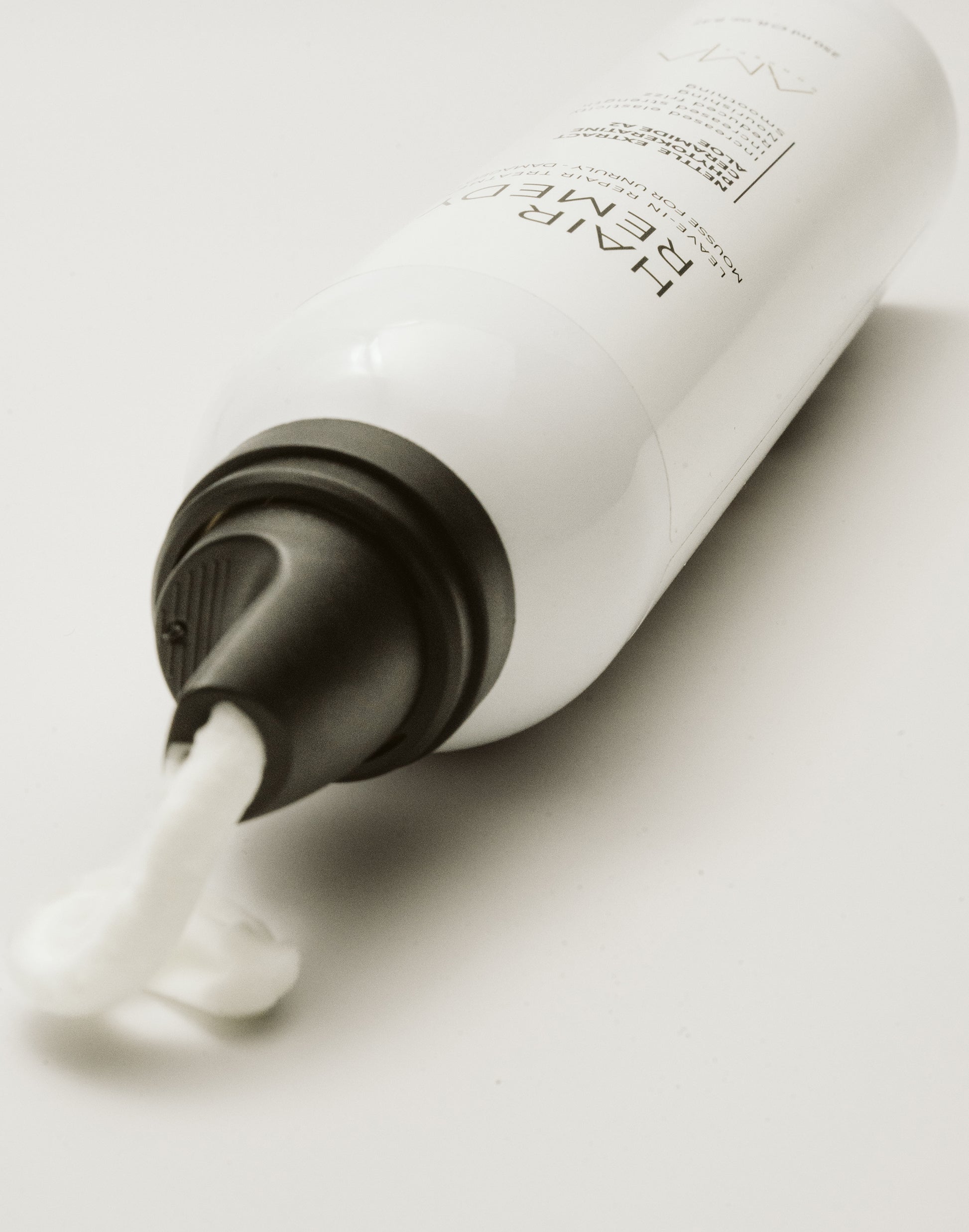 Our lightweight, nourishing mousse gives hair natural body, volume, and vitality without weighing it down. Its exclusive formula combines botanical extracts and advanced active ingredients to strengthen the hair fiber, protect it from external aggressors, and maintain optimal hydration. The result is shiny, soft, and manageable hair with a natural hold.